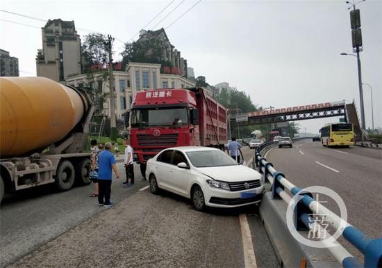 江北区公安分局交巡警支队寸滩大队民警到场后对事发经过进行了询问,心有余悸的汤先生一脸懵圈,只记得事发前自己在中间车道走得好好的,具体两车怎么擦挂的,已经完全不记得了。