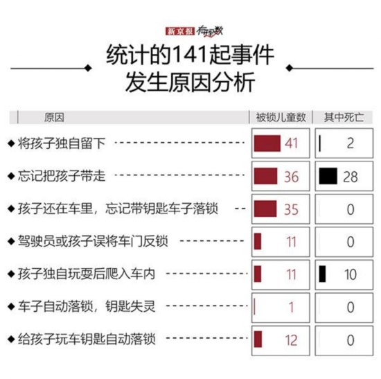 这三种原因导致的孩子被困其后果严重性也存在明显差异。其中,因监护人疏忽带来的后果最为严重,有36名儿童因为监护人忘记带走,其中28人因此死亡;11名孩子在未告知父母独自外出玩耍后爬入车内被困,其中死亡10人。