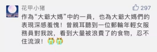 文章作者详细列举了和他同坐一艘游轮的中国大妈的不文明行为:占座、抢食、大声喧哗……在结尾处,作者鲜明地表达了他的观点:“求求中国大爷大妈们,减少出国次数,别让外国人认为中国人都是这个样子”。