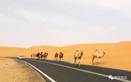2016年5月6日拍摄的阿联酋利瓦沙漠公路上的驼队。中东地区连接着东西方文明,有着悠久的历史文化和美丽的自然风光,是古丝绸之路的重要组成部分。新华社记者李震摄