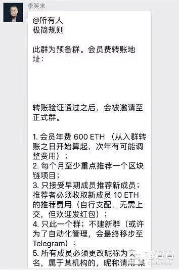 “支付600ETH的人当然不会白白付出,会通过各种办法找补回来,不仅要收回成本,还要借机大捞一笔。不仅如此,交了20ETH的人很多又自己拉群,每人收2ETH,又发展了一层下线。” 作为之前李笑来的追随者,MrChow撰文称,“ 他的解释是,600ETH是为了筛选出“合格投资者”,达到这个资产门槛的人才能和他的基金合作。这又是故意混淆概念:要求投资者证明拥有这么多资产,和要求投资者支付给他这么多资产,是两回事!”