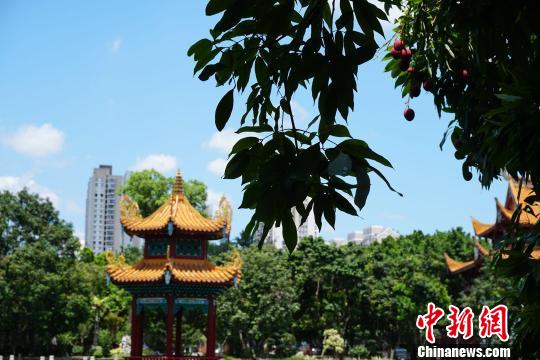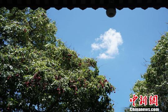 中新网福州7月10日电 (叶秋云 刘昌烨)10日,正值“夏蝉鸣荔枝红”的盛夏,福建福州西禅寺的荔枝已进入成熟期,挂满枝头,成为夏日里一道独特的风景线。