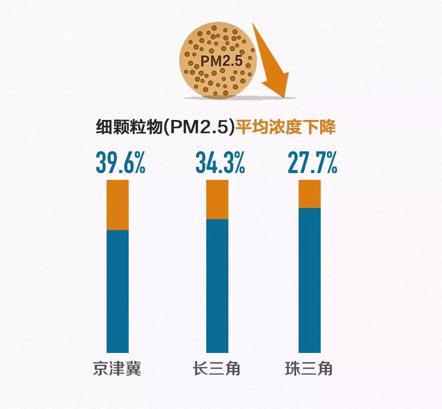 京津冀、长三角、珠三角等重点区域细颗粒物(PM2.5)平均浓度分别下降39.6%、34.3%、27.7%。