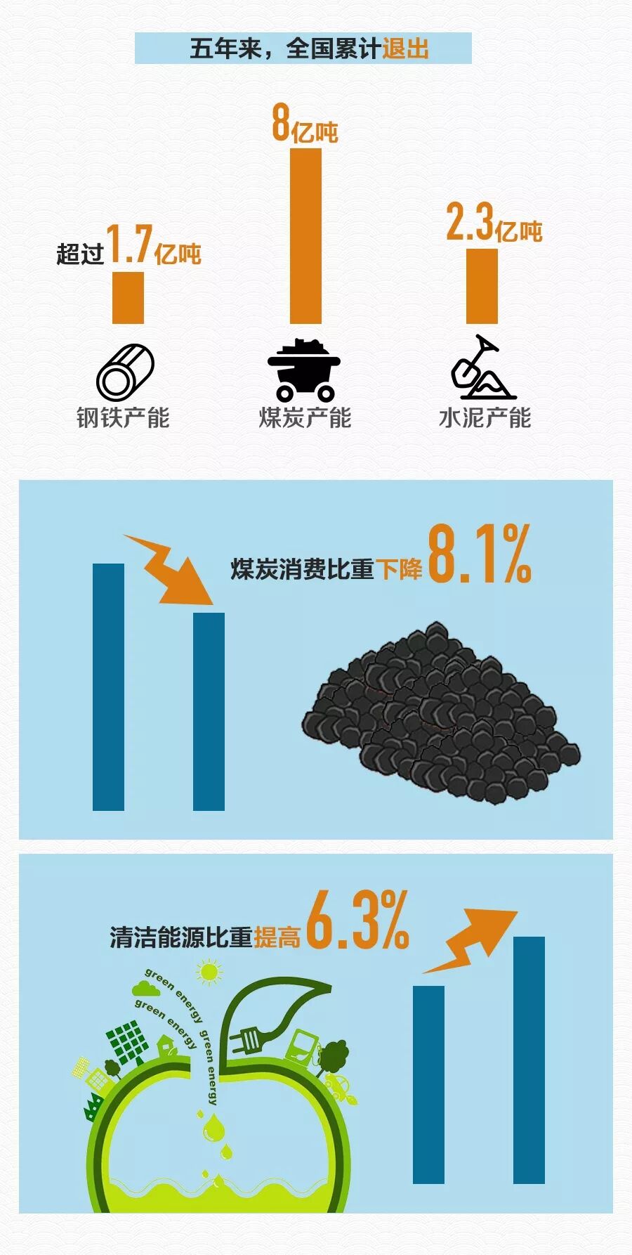 大气污染治理方面,调整优化产业结构和能源结构,五年来,全国累计退出钢铁产能超过1.7亿吨、煤炭产能8亿吨、水泥产能2.3亿吨;煤炭消费比重下降8.1个百分点,清洁能源比重提高6.3个百分点。