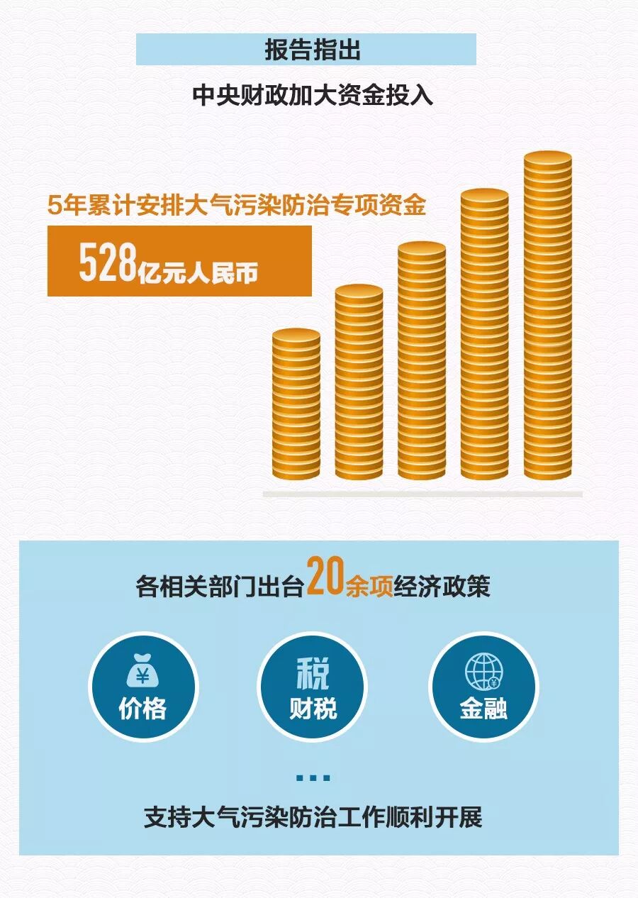 报告指出,中央财政加大资金投入,5年累计安排大气污染防治专项资金528亿元人民币。各相关部门出台20余项价格、财税、金融等经济政策,支持大气污染防治工作顺利开展。