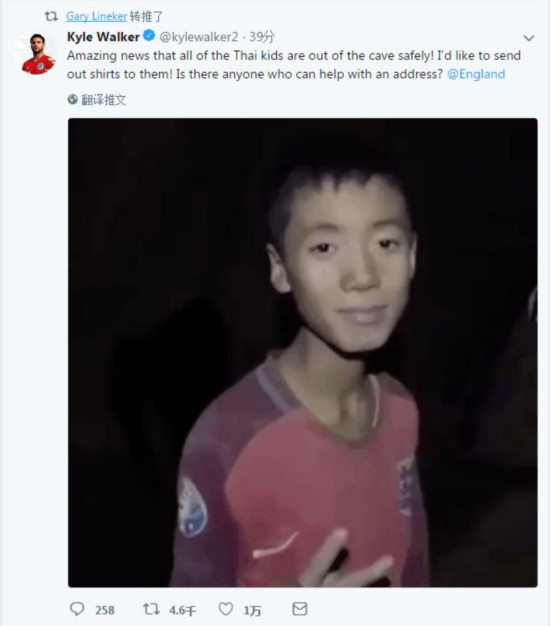 腾讯体育7月10日讯 虽然俄罗斯世界杯正进行得如火如荼,但不少球员都非常关心泰国一支少年足球队被困洞穴,在得知他们全部脱困后,英格兰国脚沃克表示希望能够送给他们英格兰球衣!