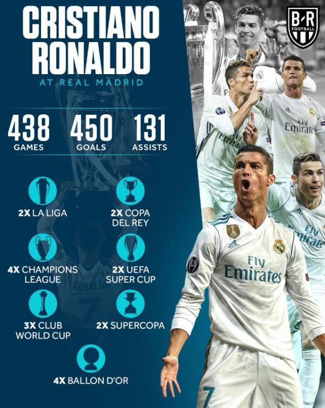 2009年6月,C罗打破世界纪录的8000万英镑转投皇家马德里。在效力皇马的9个赛季里,C罗再一次实现了突破,438次出场打入450球,成为皇马历史最佳射手的同时也成为欧冠历史最佳射手。葡萄牙人不仅帮助皇马两次赢得西甲、国王杯冠军,还四次赢得了欧冠冠军、三次赢得了世俱杯冠军。效力皇马期间,C罗不仅帮助皇马连续三次赢得欧冠冠军,而且还4度赢得金球奖,达到了职业生涯的巅峰。