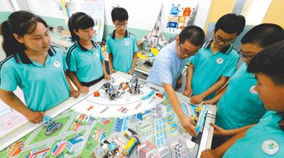河北香河第十中学暑假期间开展机器人教学课,让农村学生感受科技魅力。图为老师在向孩子们讲解机器人挑战赛的相关知识。