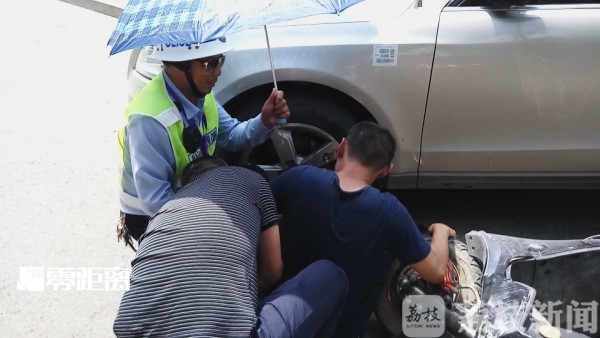 高温天气长时间暴晒极容易造成中暑,一名交通辅警巡逻路过,发现男子受伤后立刻从附近店家借来一把遮阳伞蹲在地上为男子遮阳,同时不断安慰伤者。考虑到男子口渴心里难受,又到警用摩托里取来矿泉水给男子饮用。