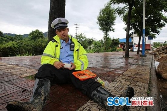 四川在线消息(付江 记者 祖明远)“睡梦中,我是听到有人在笑,难得管了,太困了。眯了十几分钟起来,才发现他们已经给我拍了这么多照片了。因为汛情,很多民警都跟我一样在一线战斗着,大家都只能见缝插针的休息一下,这种随地睡觉的很正常。”背靠着树,手里端着盒饭,沾满泥渍的双腿叉开,嘴边还有几粒米饭,他就这样睡着了……7月12日,一张交警的“不雅照”在网络上火了起来。
