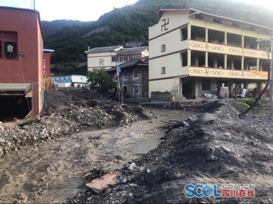 四川在线消息(李金成 记者 寇敏芳)7月13日清早,九寨沟县漳扎镇郎寨村细雨绵绵,一台履带挖掘机正在村口疏通砂石,滚滚的山洪顺着地势“占领”了村里的道路,然后进入公路旁边的排水沟。