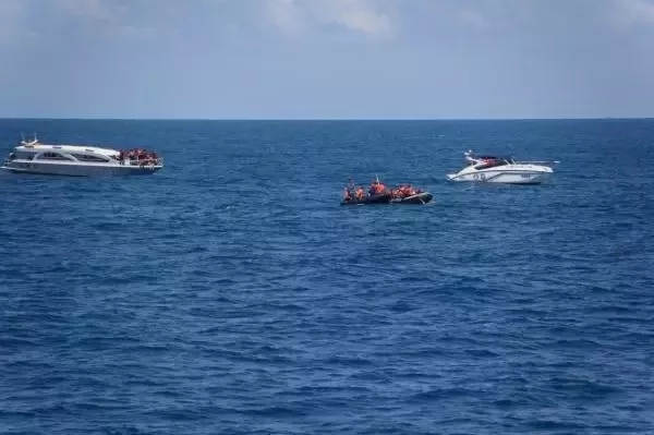 7月7日,在泰国普吉,救援人员在游船倾覆附近的海域进行搜救。新华社 图