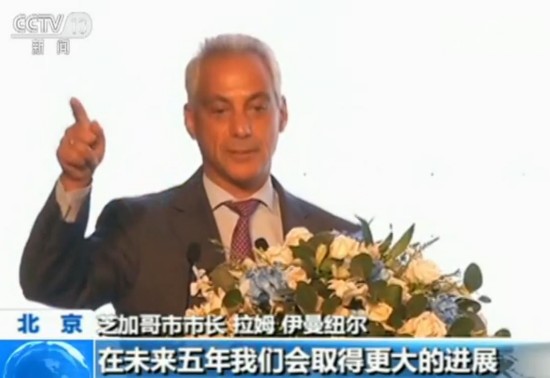 芝加哥市市长 拉姆·伊曼纽尔:五年前我们签署了芝加哥和中国的八个城市之间的谅解备忘录,从那以后,中国和芝加哥的贸易增加了100%,在未来五年我们会取得更大的进展。特别考虑到世界存在的一些状况,我们的合作是至关重要的,我们反对对抗,我现在宣布,我非常有信心,我们是合作性的竞争。