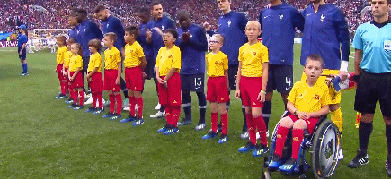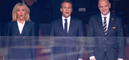 腾讯体育7月15日讯,2018世界杯决赛,法国对阵克罗地亚,开赛前,双方演奏国歌,法国总统严肃演唱,残疾球童坐轮椅现身。