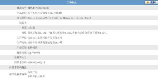 长生生物冻干人用狂犬病疫苗(Vero细胞)的药品注册信息 来源:国家药监局网站