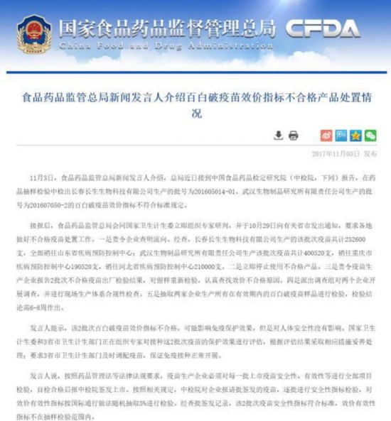 2017年11月3日,原国家食药监总局发布了百白破疫苗效价指标不合格产品处置情况介绍,称在药品抽样检验中检出长春长生生物科技有限公司生产的批号为201605014-01的百白破疫苗效价指标不符合标准规定。