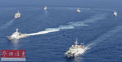 资料图:多艘中国海警船和日本海上保安厅巡逻船在钓鱼岛海域对峙。
