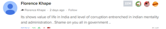 “这说明了印度人的生命价值,和在印度人思想和管理中根深蒂固的腐败程度。你们这些政府人员都是可耻的。”