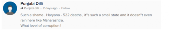 “太耻辱了!连哈里亚纳邦这么小的一个邦都有522死亡于此,这地方甚至不像马哈拉施特拉邦那样总下雨。腐败太严重了!”