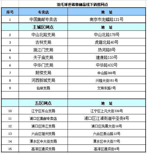 羽毛球世锦赛纪念邮品15个销售网点列表