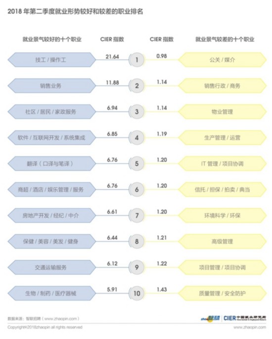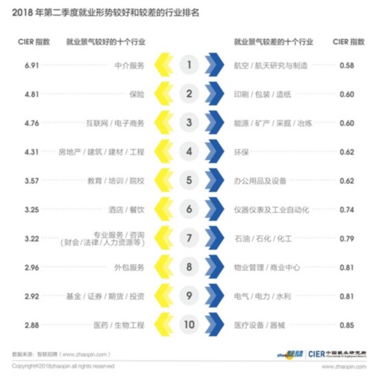 17日,中国人民大学中国就业研究所联合智联招聘发布2018年第二季度《中国就业市场景气报告》,报告显示,从行业来看,就业景气最好的仍为中介服务行业,而互联网行业热度下降。东北地区就业形势持续恶化,就业景气指数(CIER)仍小于1,而珠三角招聘职位数增幅最大,远高于全国平均水平。