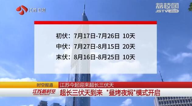 由于今年中伏有20天,所以今年"三伏天"比较长,一共有40天,到8月下旬才出伏。入伏后,江苏也正式进入"昼烤夜焖"模式。不仅最高气温在35℃以上,最低气温也有27℃左右。