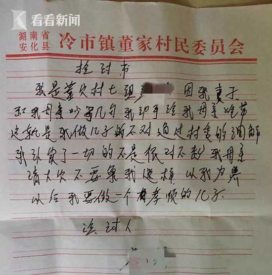 据悉,7月15日,冷市镇董家村村民委员会已让男子写了检讨书。检讨书内容如下:因我妻子与我母亲吵了几句,我就给我母亲吃草。这是我做儿子的不对。通过村委会调解,我认识到了自己的不是,很对不起我母亲。请大家不要像我这样,以我为戒。以后我要做一个孝顺的儿子。