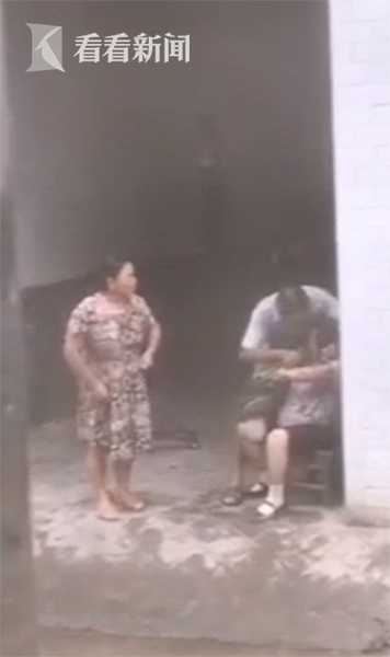 视频显示,男子手里拿着一把草正往坐在椅子上的老人嘴巴里塞。该男子口中还不停地念叨:吃草吧你。旁边还有一名中年女子,不时地用手指着老人大骂。