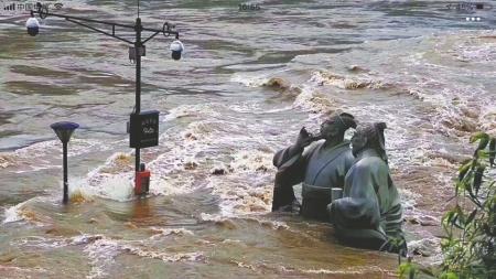 7月17日上午,受岷江上游降雨和金沙江上游水库群腾退库容影响,宜宾迎来了2013年以来的最大洪峰。随着岷江水位不断上涨,宜宾滨江公园内苏轼与黄庭坚4米高的雕像,也逐渐被江水淹没。有市民用手机拍下了这一幕,苏轼、黄庭坚雕塑洪峰逆流中“吟诗”的视频迅速刷爆了朋友圈。