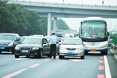 这位司机将面临行政拘留15天的处罚。半小时内,和他一起被拦下的另外32人都因违法占用公交车道,被罚款200元。记者了解到,目前本市高速路公交车道遭占用的情况比较普遍,京通快速路等处的公交车道,探头位置早已被司机们摸清,每逢即将抵达探头下方时,违法车辆都会刹车并线,使得守法车辆的正常行驶秩序受到更多影响。 张耀 摄 J060