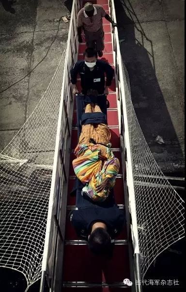 正在吉布提执行“和谐使命—2010”医疗服务任务的中国海军和平方舟医院船官兵正把当地病人通过舷梯抬到船上治疗。这条舷梯因而被当地人称为“生命通道”。