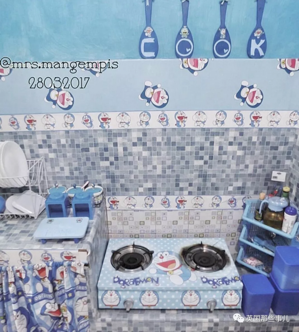 墙面能画的地方都画上了蓝胖子,让厨房变出魔法吧...