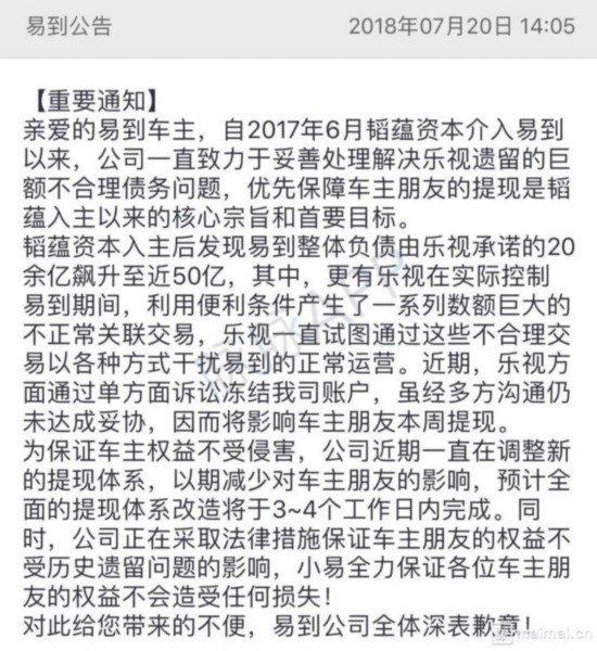 易到方面称,导致司机无法提现的原因正是因为乐视。去年6月,易到宣布公司已于近日将股东从乐视变更为韬蕴资本。而今日,韬蕴称,入主易到后发现易到整体负债由乐视承诺的20余亿飙升到近50亿,其中更有乐视在实际控制易到其间,利用便利条件产生了一系列数额巨大的不正常关联交易,并一直试图通过这些不合理交易以各种方式干扰易到的正常运营。