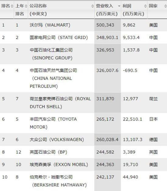 按照营业收入排名,沃尔玛连续第五年问鼎榜首,中国的国家电网、中石化和中石油分列第二到四位,排序与去年没有变化。荷兰皇家壳牌石油公司从第七位跃升至第五位,日本丰田汽车和德国大众汽车紧随其后。