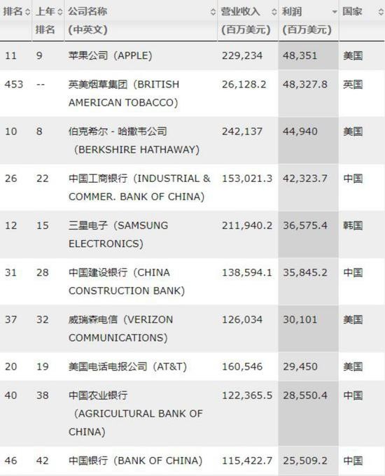 按照利润总额来排名,科技巨头苹果公司高居榜首,排在第二位的是英美烟草集团,“股神”巴菲特旗下的伯克希尔哈撒韦公司排名第三。利润榜前十位的四家中国公司仍然是工建农中四大银行。