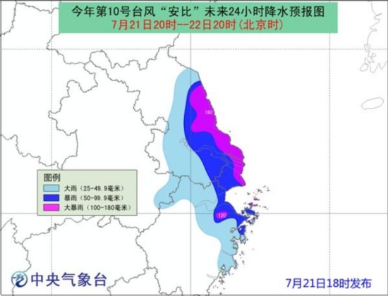 降水预报:21日20时-22日20时,浙江北部、上海、江苏中南部、安徽东南部等地有大到暴雨,其中浙江东北部、上海东部、江苏东部有大暴雨(100~180毫米)。