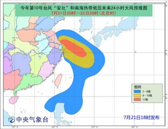 大风预报:21日20时-22日20时,黄海西南部、东海北部和东部,以及江苏中南部沿海、长江口区、杭州湾、浙江北部沿海将有7-9级大风,“安比”中心经过的附近海域和地区风力可达10-11级,阵风12-13级;南海东北部、巴士海峡、台湾以东洋面将有7-8级大风。