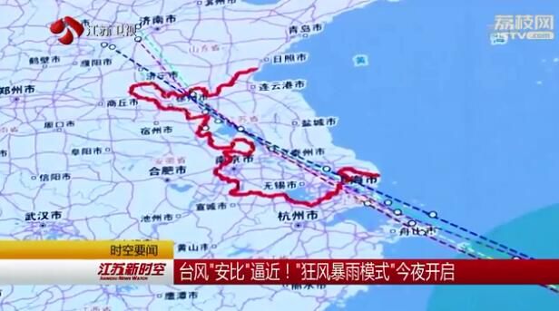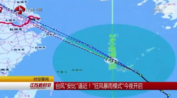 江苏台记者 罗聪懿:“这里是省防汛指挥中心,从现场大屏上我们可以看到,上午11时,台风"安比"已经进入了东海东南部海域,并以每小时35公里的速度向西北方向移动。由于台风路径存在不确定性,目前推测台风登陆地点会在浙江临海到江苏启东一线沿海区域,登陆时最强风力可达12级。而根据目前趋势来看,我省苏南地区21日夜间就将受到台风影响,明天我省大部分地区都将迎接狂风暴雨天气。”