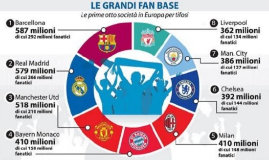 尽管说AC米兰似乎距离冠军已经远去多年,过去的10年间,球队处于一个下滑的过程。不过根据意大利媒体LIBERO,在一年前对欧洲八大豪门的球迷人数进行统计的报告中显示,巴萨球迷有5.87亿之多,其中死忠球迷就有2.92亿;皇马的5.79亿球迷中有2.66亿死忠,AC米兰排名第五,跟第四名的拜仁慕尼黑一样,都是拥有4.1亿球迷,只是因为红黑军团的死忠人数为1.48亿,比之德甲豪门少了1000万,因此位居第五。不过,这个数字依旧说明了AC米兰的“江湖地位”。很显然,百年豪门的底蕴,不是短暂的低谷可以抹去的。