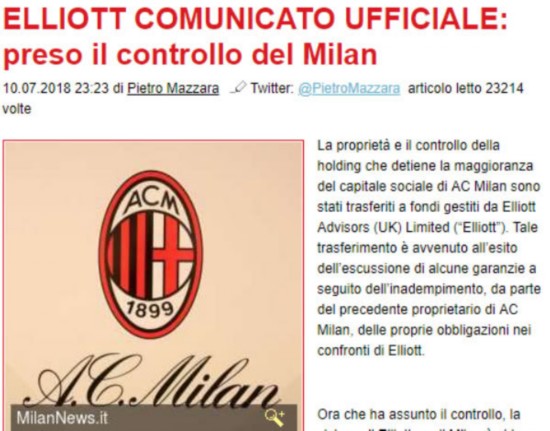 腾讯体育7月21日讯 AC米兰官方宣布:埃利奥特对冲基金目前已经正式接手红黑军团管理层,李勇鸿将不再担任球队老板。对于球队被一家对冲基金所接管,这一点一定让无数的AC米兰球迷心痛不已。