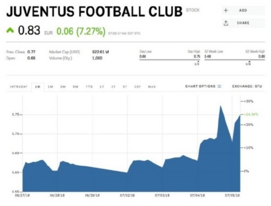 在另外的一个方面,由于C罗转会带来的影响,尤文图斯的股价暴涨了22%,整体市值增加了1.6个亿。这些数据,其实都说明了整个市场对于C罗转会尤文图斯的支持与认可。同样的,这些数据最终会惠及整个意甲平台,让所有在意甲的球队,都得到一份荣耀。