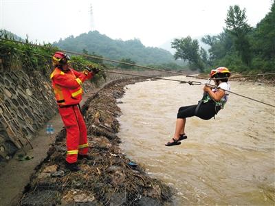 7月21日,密云区石城镇高家岭村,消防队员利用绳索营救被困人员。密云消防供图