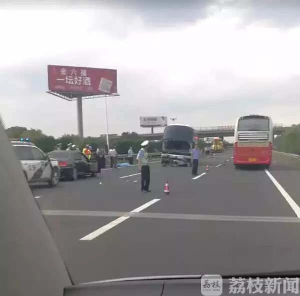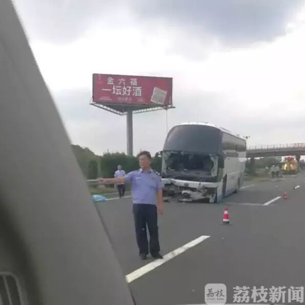 一辆由安徽来安开往江苏泰兴的安徽号牌的大型普通客车(该车核载53人,实载21人,含两名未成年儿童)由西向东行驶至事发路段时,疑似爆胎后与高速公路中央隔离带发生碰撞并穿越中央隔离带,事故导致该车上两名未系安全带的两名乘客(一男一女,身份待查)摔出车外,当场死亡,车辆及高速公路路产受损。