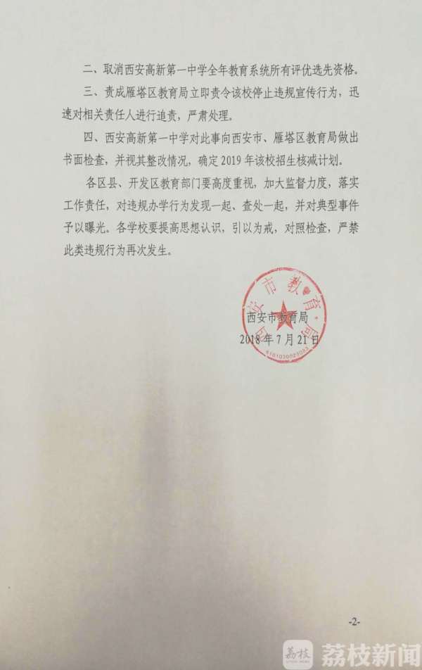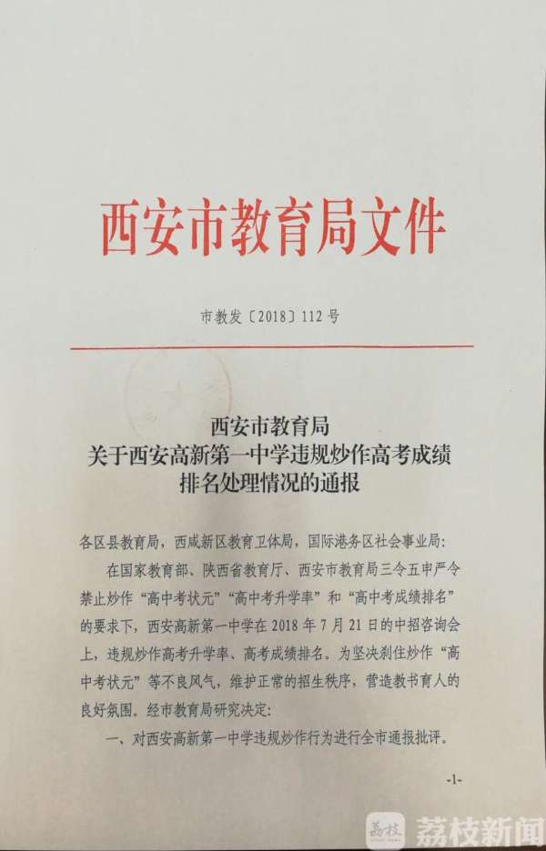 7月21日下午,西安市教育局发布公告,在当天举行的西安市中招咨询会上,西安高新第一中学违规炒作高考升学率、高考成绩排名。决定对该校进行全市通报批评;取消全年教育系统所有评优选先资格;对相关责任人进行追责;视整改情况,确定2019年该校核减招生计划。