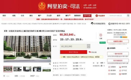 面积1219平方米(约13121平方英尺)、起拍价逾6000万,一套有可能是杭州史上最贵法拍商品房,出现在“阿里拍卖o司法”频道。该房产位于杭州上城区阳光海岸,将于8月16日10时至8月17日10时在阿里拍卖进行公开拍卖,钱江晚报记者从杭州上城区法院了解到,目前尚无人缴纳保证金准备参拍。不过围观群众有3400多人,180多人设置了提醒,距离正式拍卖也还有20多天。