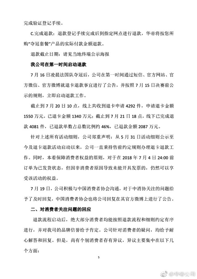 华帝公司称,7月16日凌晨法国队夺冠后,公司在第一时间通过短信、官方网站、官方微信、官方微博就退卡退款事宜进行了公告,并按照7月15日决赛前公示的规则,立即启动退款工作。