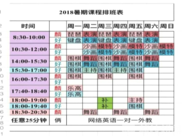 在杨女士为孩子定制的暑期课表上,模特、表演、沙画、围棋、英语……10种课程排的是密密麻麻。