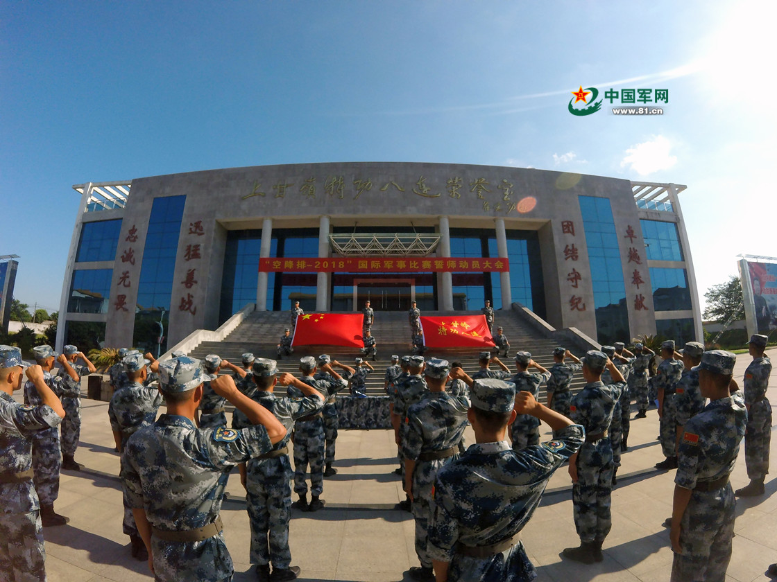 誓师大会现场,中国“空降排”参赛队所有官兵面对国旗和上甘岭战旗庄严宣誓。方超 摄