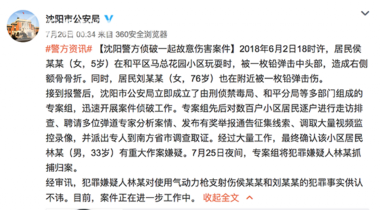 7月26日凌晨零点三十四分,沈阳市公安局官方微博发布消息称,2018年6月2日18时许,居民侯某某(女,5岁)在和平区马总花园小区玩耍时,被一枚铅弹击中头部,造成右侧额骨骨折。接到报警后,沈阳市公安局立即成立了由刑侦禁毒局、和平分局等多部门组成的专案组,迅速开展案件侦破工作。专案组先后对数百户小区居民逐户进行走访排查、聘请多位弹道专家分析案情、发布有奖举报通告征集线索、调取大量视频监控录像,并派出专人到南方省市调查取证。