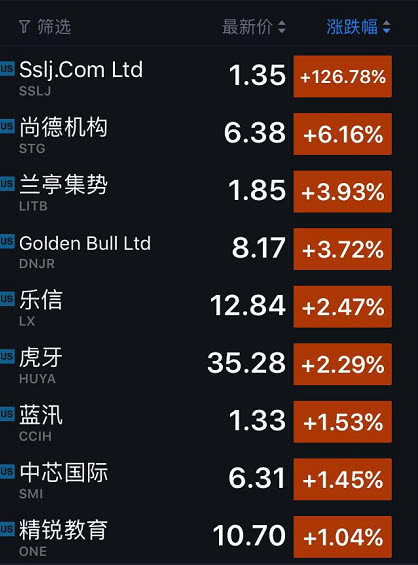 另一方面,涨幅较大的公司则包括:盛世乐居(涨126.78%)、尚德机构(涨6.16%)、兰亭集势(涨3.93%)、点牛金融(涨3.72%)、乐信(涨2.47%)、虎牙(涨2.29%)、蓝汛(涨1.53%)、中芯国际(涨1.45%)和精锐教育(涨1.04%)。